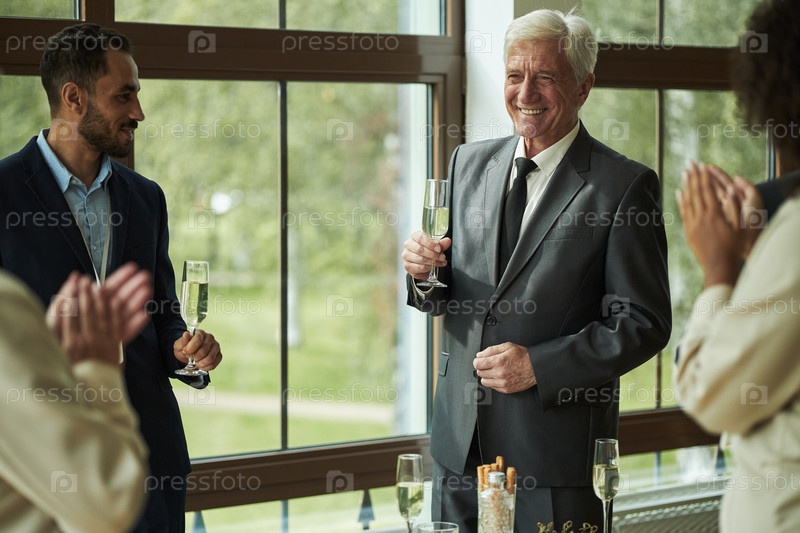 Старший мужчина улыбается, держа чашку шампанского во время празднования