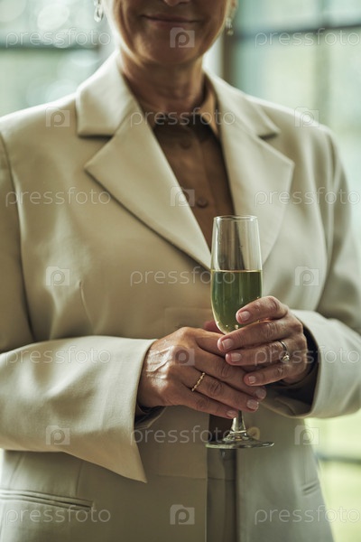 Женщина среднего возраста держит бокал шампанского во время общественного собрания