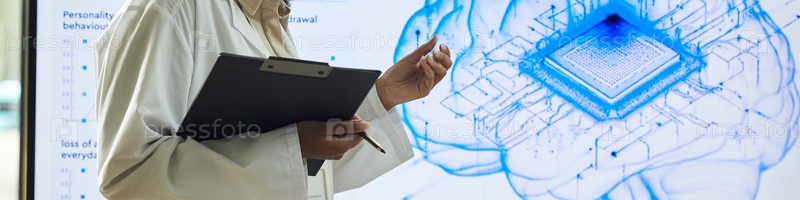 Женщина средних лет исследует искусственный интеллект, интерфейс мозга
