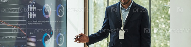 Молодой взрослый мужчина представляет визуализацию данных на интерактивном экране