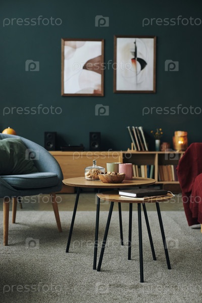 Современный интерьер гостиной с кофейным столом со закусками и книгами