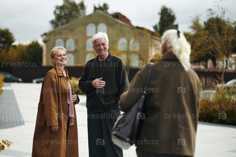 Старшая пара улыбается, приветствуя подругу средних лет на открытом воздухе