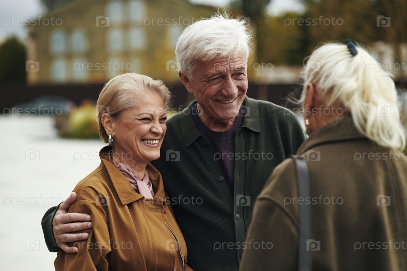 Старшая пара улыбается, приветствуя друга на открытом воздухе