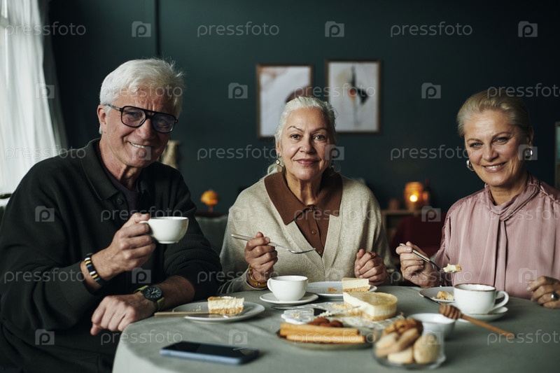 Старший мужчина и две женщины наслаждаются чаем и десертом вместе за обеденным столом