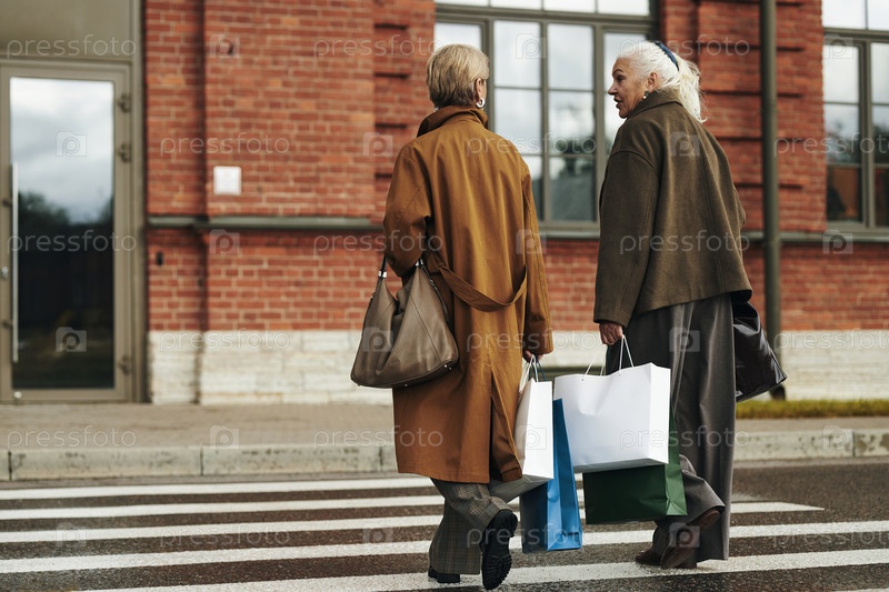 Пожилые женщины ходят на улице, неся сумки для покупок и беседуя