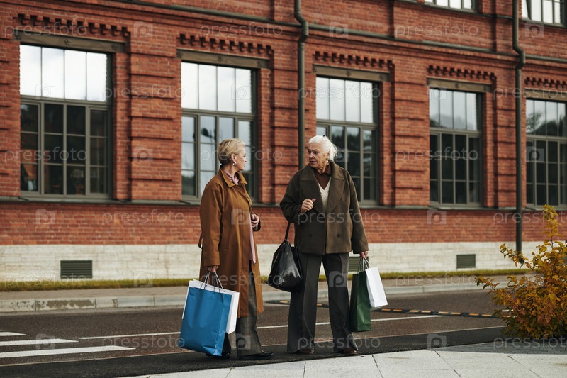 Женщины-старшеклассницы, гуляющие на свежем воздухе, вовлечены в разговор после покупок