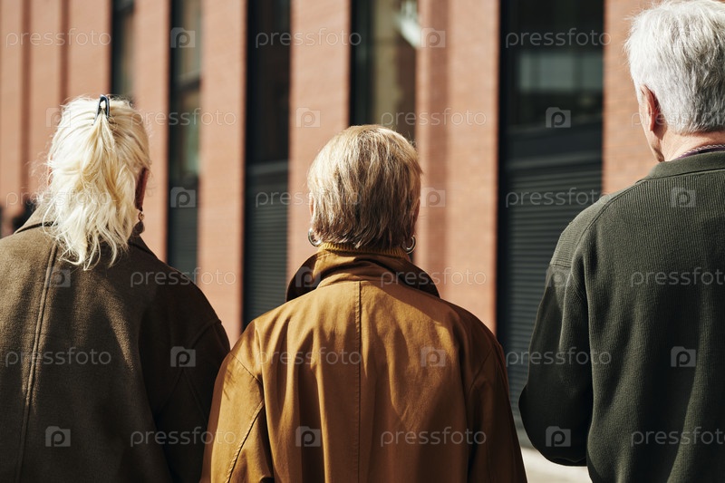 Три старших взрослых гуляют вместе на открытом воздухе возле кирпичного здания