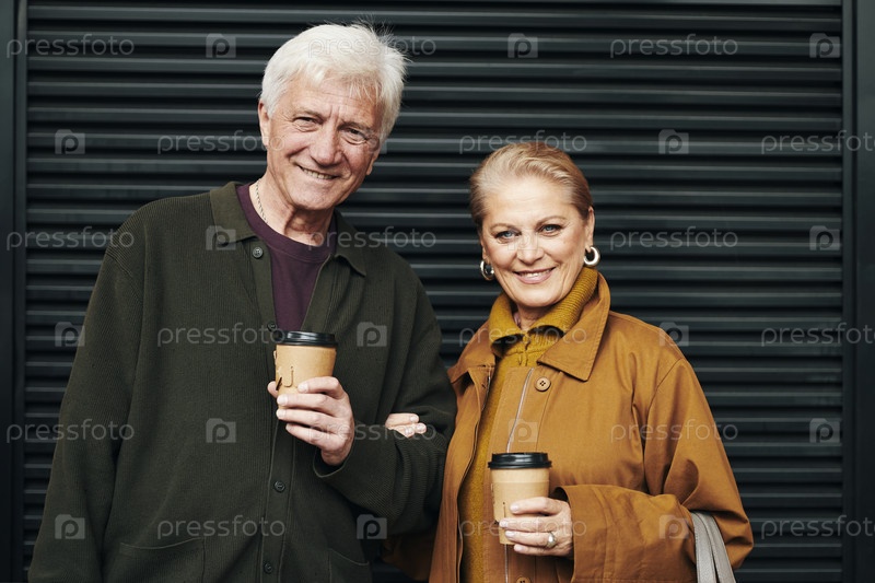 Старший мужчина и женщина улыбаются, держа кофе на свежем воздухе