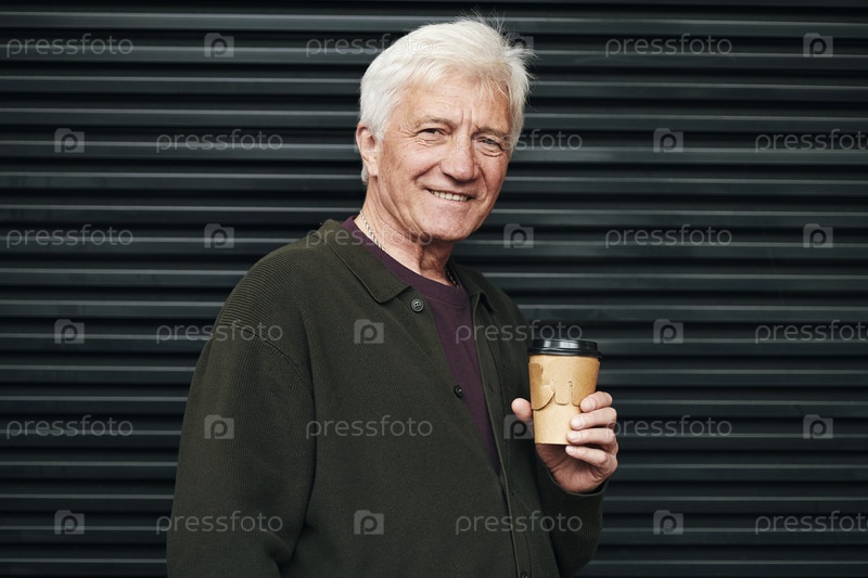 Портрет старшего человека, улыбающегося в то время как он держит чашку кофе на вынос