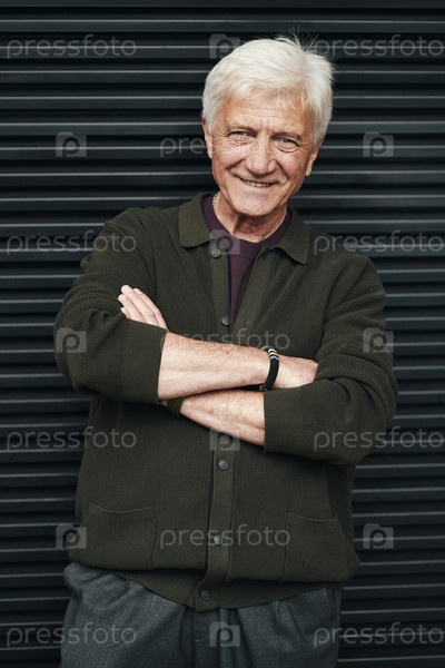 Портрет пожилого человека, улыбающегося с перекрещенными руками на открытом воздухе