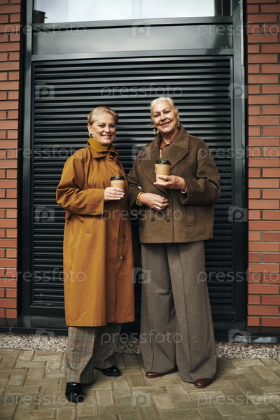 Пожилые женщины стоят на улице, держат чашки с кофе и улыбаются вместе