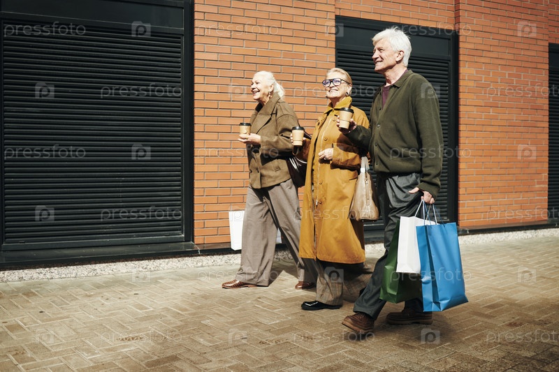 Пожилые женщины и мужчины ходят на улице, неся кофе и сумки для покупок