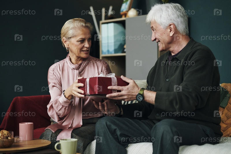 Пожилая женщина дарит подарочный ящик улыбающемуся мужчине в помещении