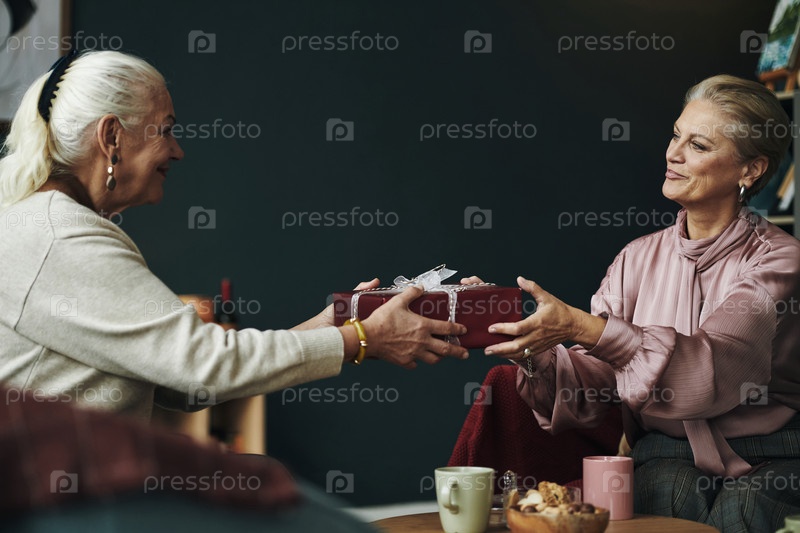 Пожилые женщины обмениваются коробками для подарков, сидя вместе в помещении