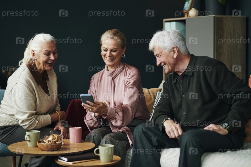 Пожилые женщины и мужчины улыбаются, используя смартфон в помещении