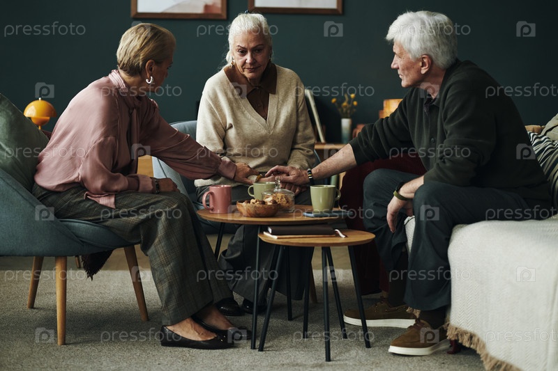 Группа старших друзей, которые делятся закусками и беседуют в помещении