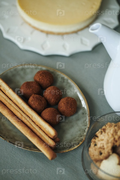 Различные кондитерские шарики и хлебные палочки, расположенные на керамической тарелке для десерта