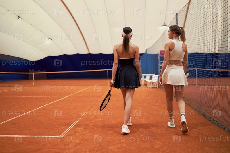 Молодые взрослые женщины ходят по крытому теннисному корту после матча