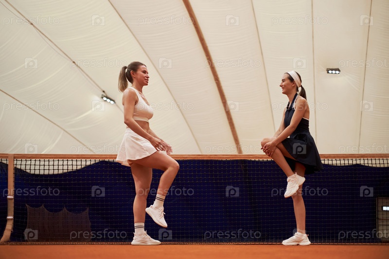 Две молодые женщины растягивают ноги на крытом теннисном корте Net