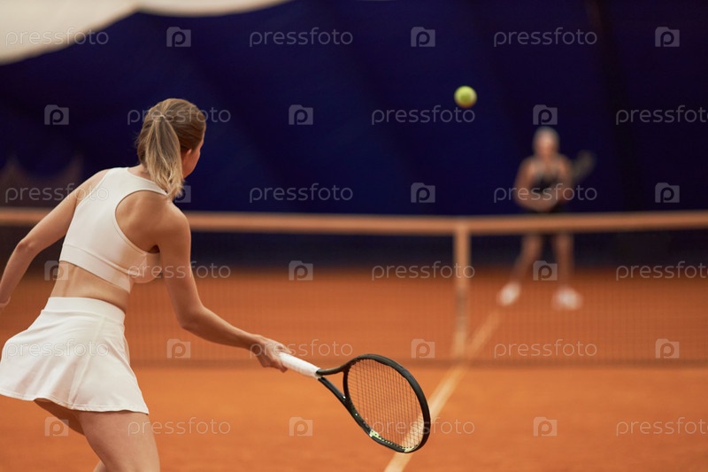 Молодая взрослая женщина играет в теннис на крытом корте с противником