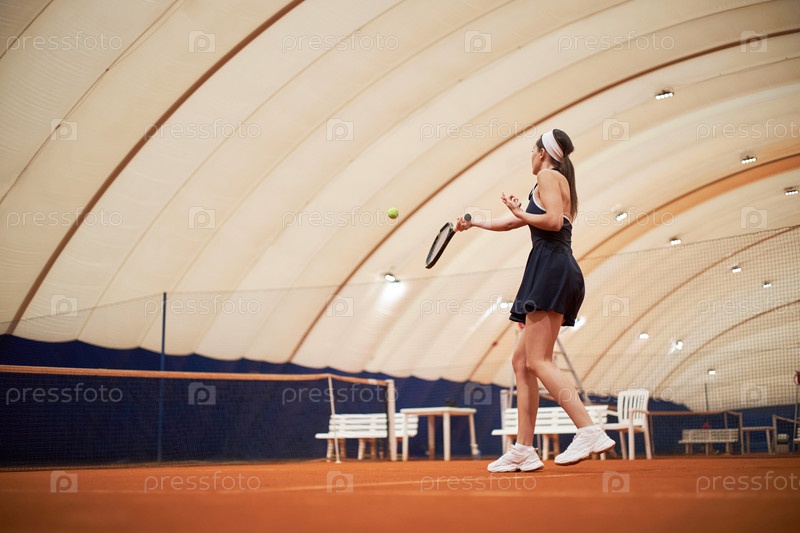 Молодая взрослая женщина играет в теннис в помещении, бьёт мяч с ракетой