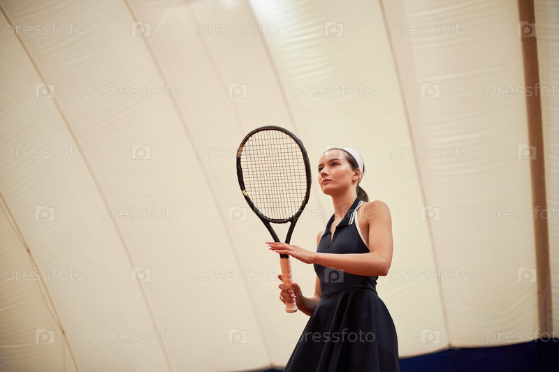Молодая взрослая женщина готовится подавать теннисный мяч в помещении