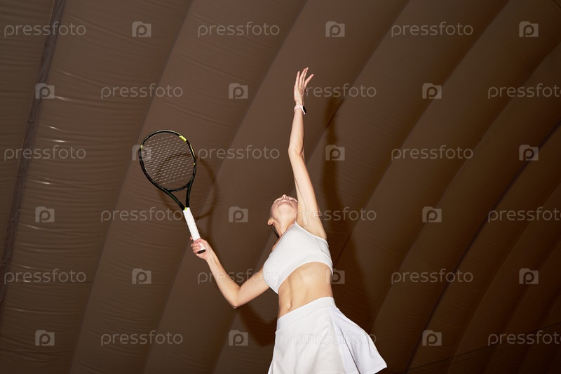 Молодая взрослая женщина подает теннисный мяч в помещении во время матча