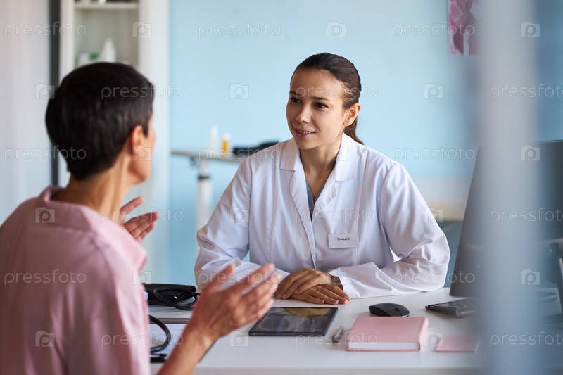 Молодой взрослый врач-женщина консультирует женщину среднего возраста о раке