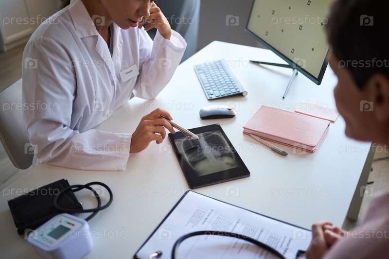 Женщина-врач показывает рентген грудной клетки пациенту среднего возраста, обсуждающему рак
