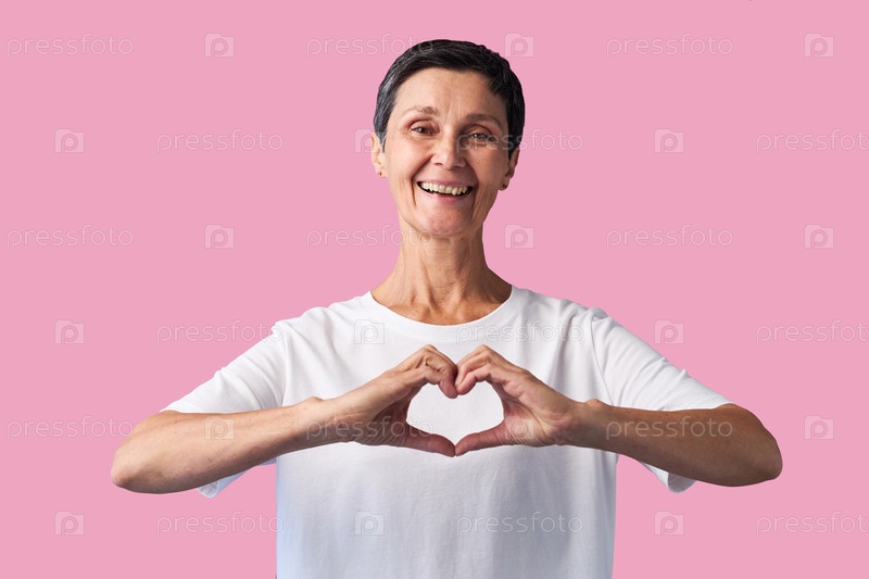 Портрет женщины среднего возраста, улыбающейся и делающей сердечный жест