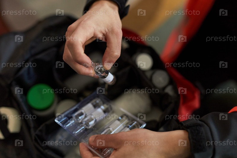 Руки парамедика, готовящего флакон лекарств для экстренной инъекции