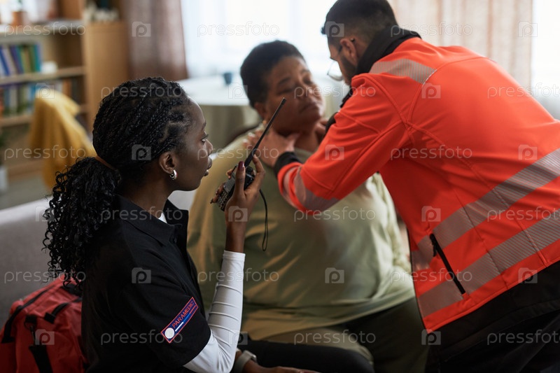 Чернокожая женщина среднего возраста получает медицинскую помощь от парамедиков в помещении