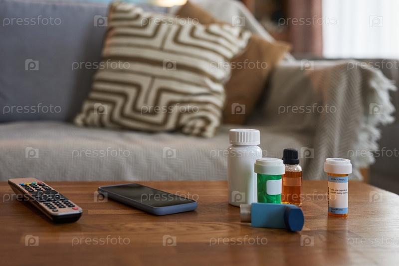 Различные рецептурные лекарства и ингалятор расположены на деревянном кофейном столе