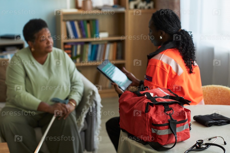 Чернокожая женщина среднего возраста консультирует молодую женщину парамедика в помещении