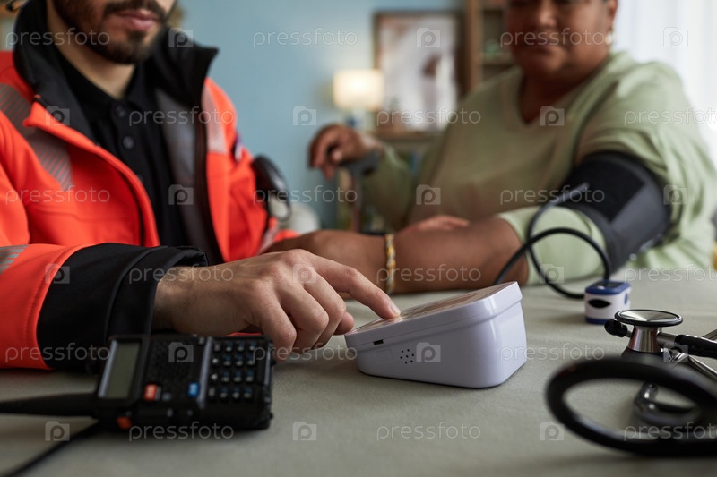 Парамедик измеряет кровяное давление женщины среднего возраста дома