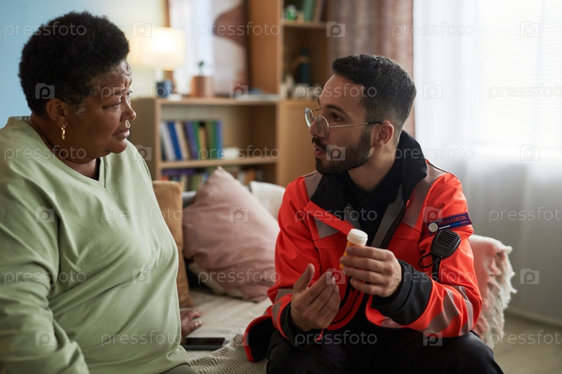 Молодой мужской фельдшер объясняет инструкции по лекарствам старшей чернокожей женщине