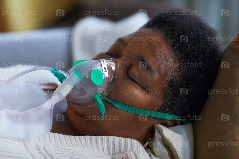 Старшая чернокожая женщина отдыхает с кислородной маской во время медицинского лечения дома