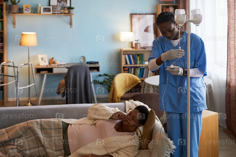 Старшая чернокожая женщина отдыхает, в то время как молодая черная медсестра корректирует IV капли