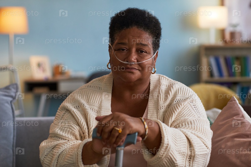 Портрет старшей чернокожей женщины с инвалидностью, использующей кислородотерапию дома