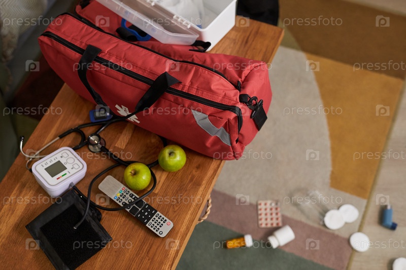 Медицинское оборудование и материалы разбросаны по столу и полу в домашних условиях
