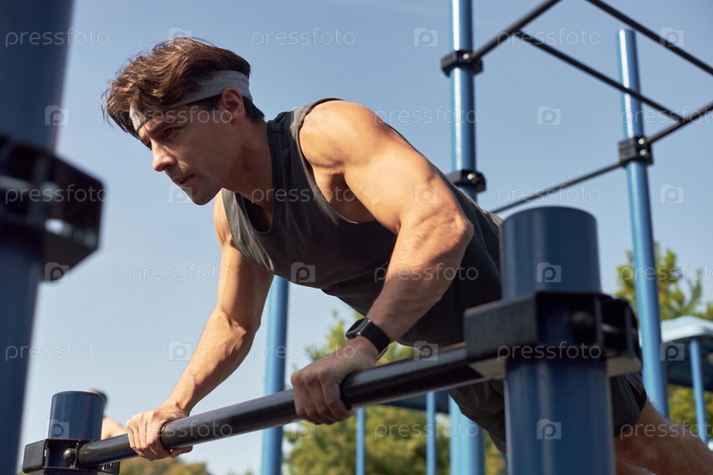 Молодой взрослый мужчина занимается на открытом воздухе с помощью параллельных баров