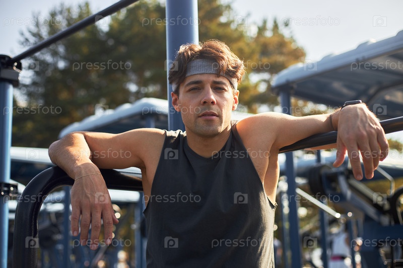 Портрет молодого взрослого мужчины, отдыхающего после тренировки на свежем воздухе