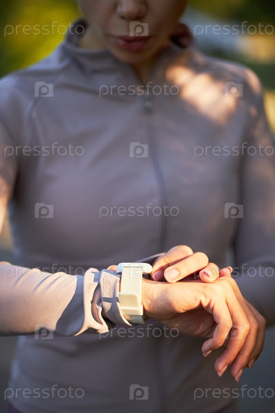 Молодая взрослая женщина проверяет фитнес-трекер во время занятий спортом на свежем воздухе