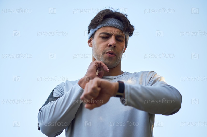 Молодой взрослый мужчина проверяет пульс, одновременно следя за прогрессом фитнеса