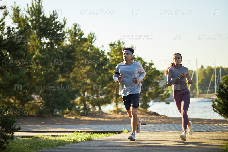 Молодой мужчина и женщина бегают вместе на открытом воздухе возле озера утром