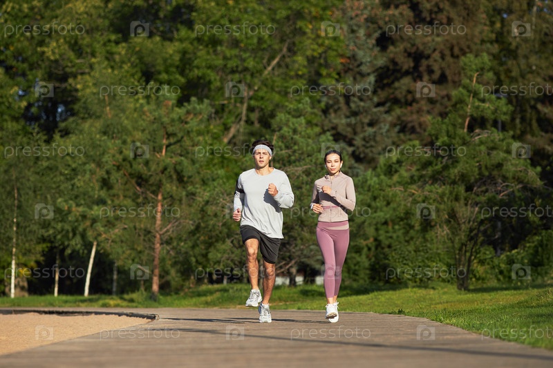 Молодой человек и молодая женщина бегают вместе на свежем воздухе