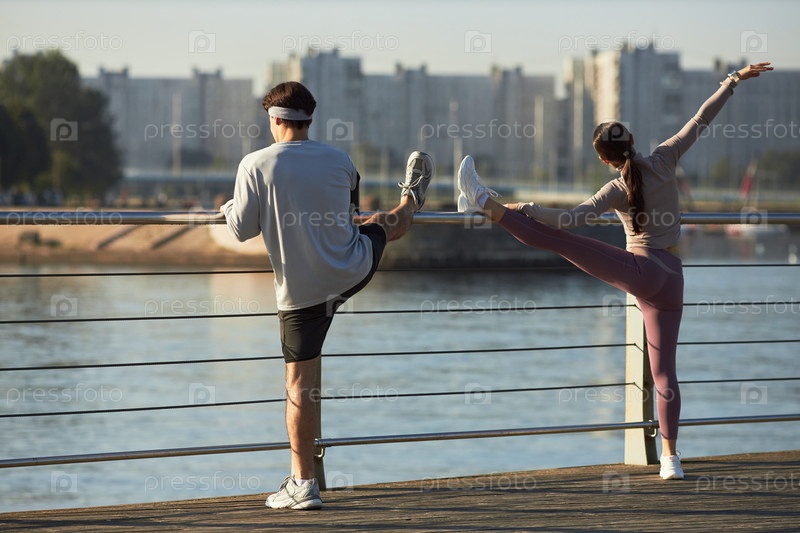 Молодой человек и молодая женщина растягиваются на улице у реки