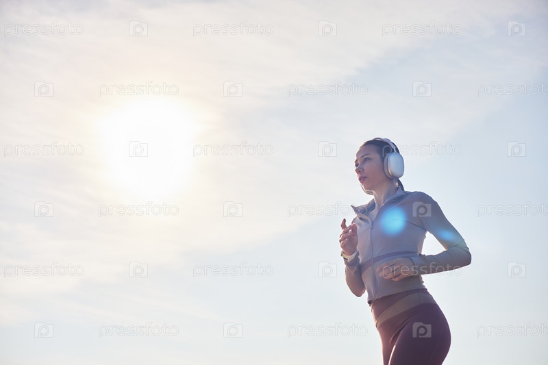 Молодая взрослая женщина бегает на улице, слушает музыку по наушникам