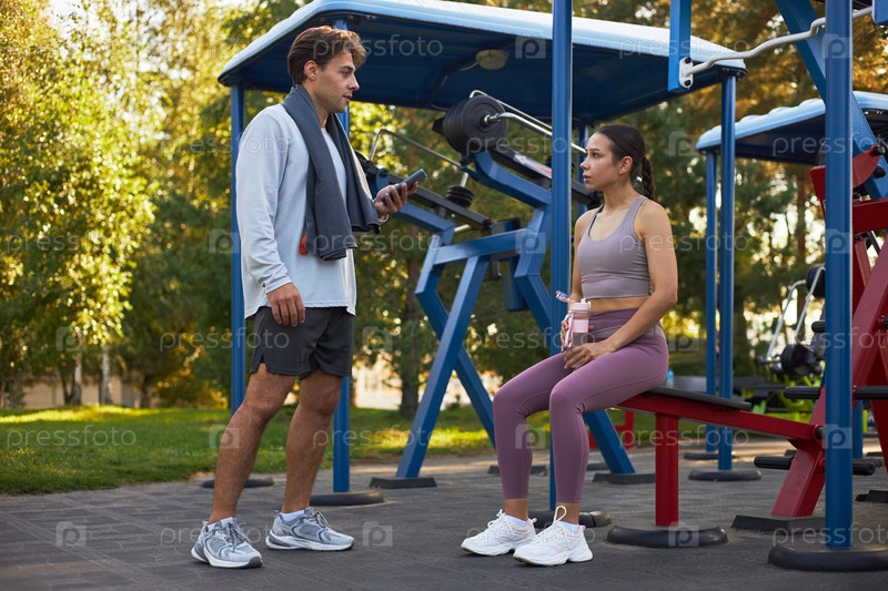 Молодой человек разговаривает с молодой женщиной, отдыхающей после тренировки
