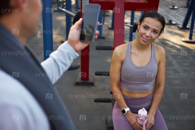 Молодая взрослая женщина улыбается, сидя на оборудовании для открытого тренажерного зала